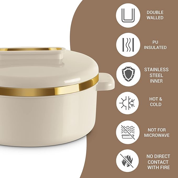 - Double walled Inner stainless-steel casserole keeps food hot and fresh for hours. The Exclusive metallized foil, unique design and elegant shape enhances your dining décorum and thus makes it a must-have casserole for your home.