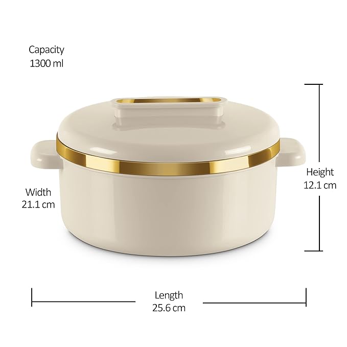 - Colour: Ivory; Material: Inner Stainless Steel; Package Contents: 1 - Piece Curve Casserole (1300 ml); Product Dimension in cms (L x W x H): 25.6 x 21.1 x 12.1; For any query/assistance please contact us.