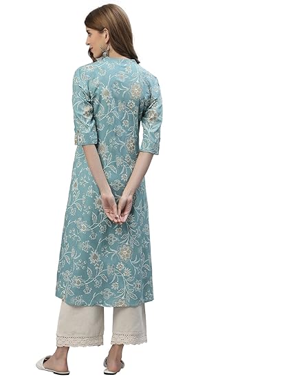 - Floral Printed Rayon A-Line Kurta with Wooden Button Detailing
